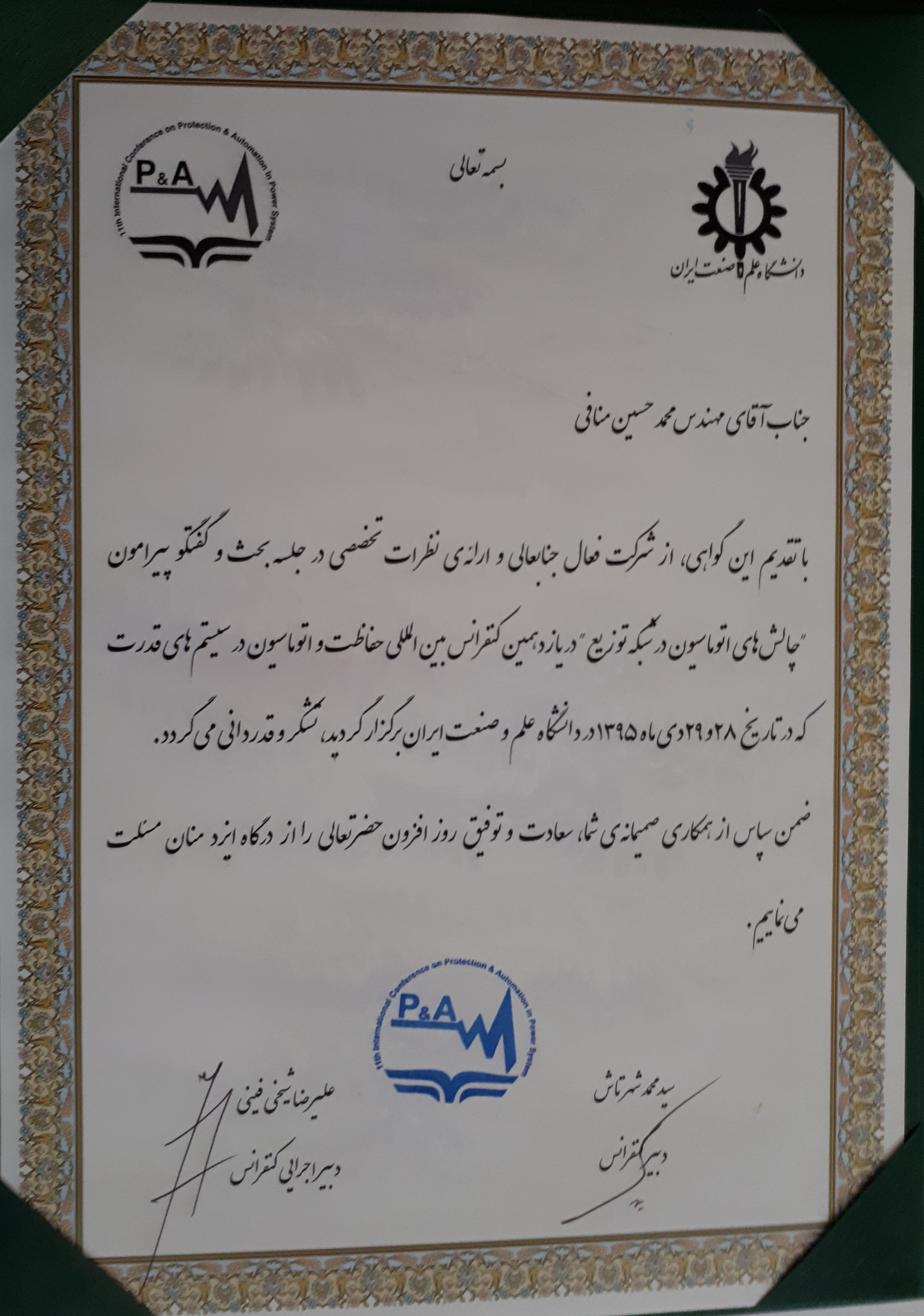 تقدیرنامه یازدهمین کنفرانس بین المللی حفاظت و اتوماسیون در سیستم های قدرت
