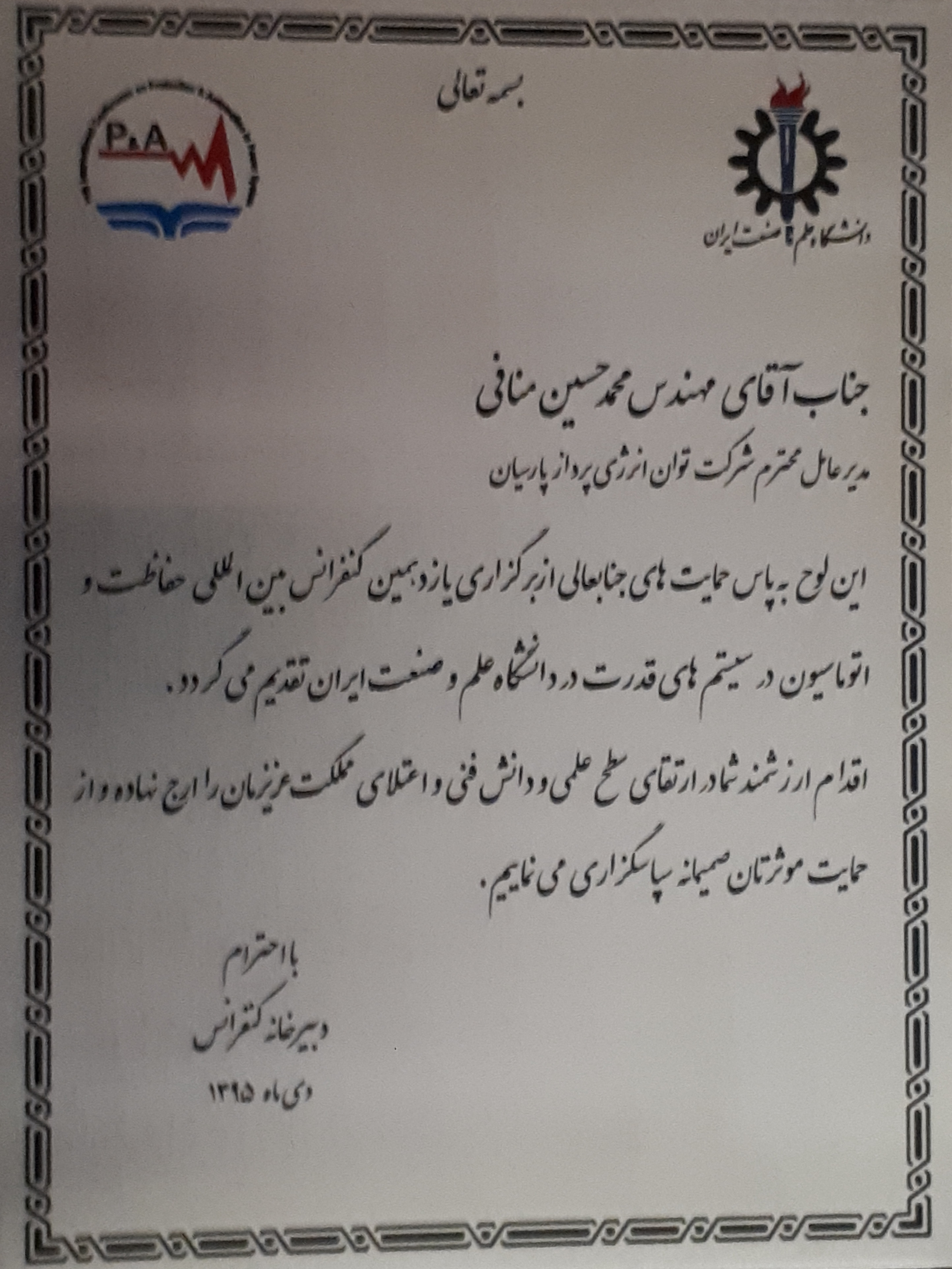 دریافت تقدیرنامه از یازدهمین کنفرانس بین المللی حفاظت و اتوماسیون در سیستم های قدرت که در دانشگاه علم و صنعت ایران برگزار شد.
